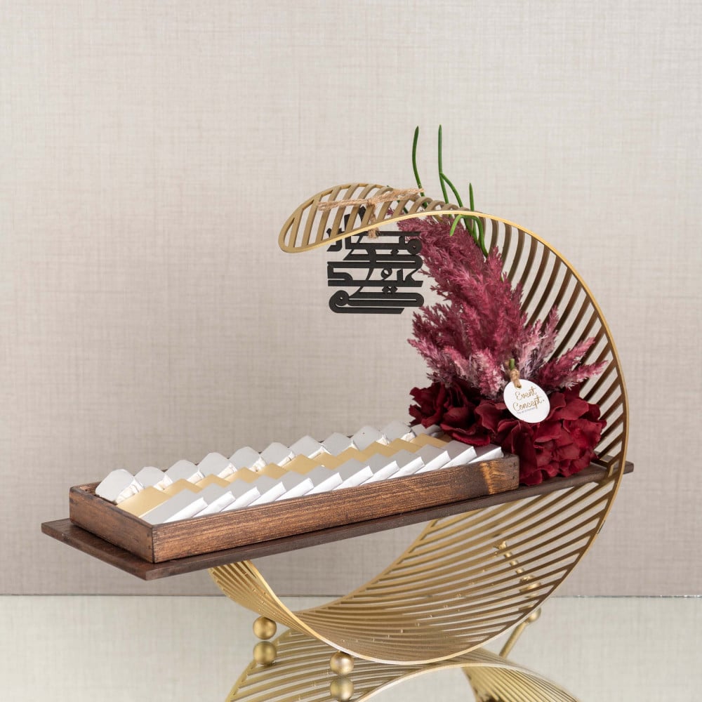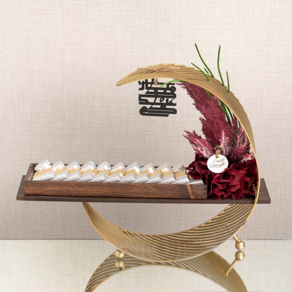 صينية الهلال من الحديد والخشب ذات زخرفة حديثة مزينة بزهور صناعية تحتوي على نصف كيلو من الشوكولاتة البلجيكية والسويسرية